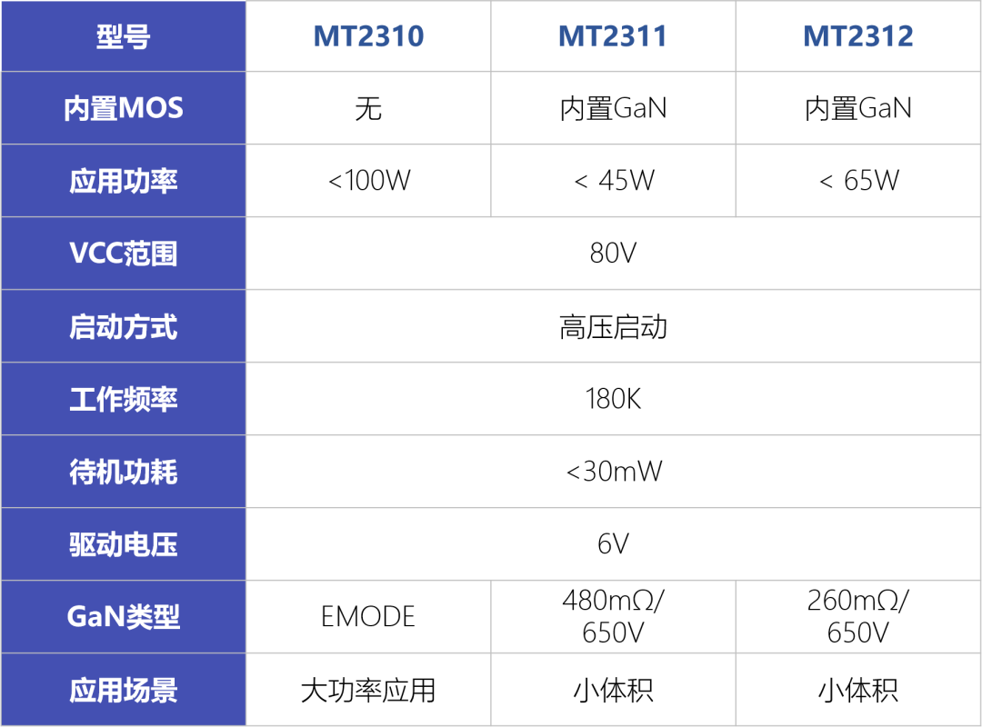 65W以内分离式整体方案典型应用如上图所示。SSR控制器方面,客户可根据需求使用驱动Si MOS的MT2300或使用驱动GaN功率管的MT2310。同步整流(SR)控制器使用支持宽电压输出、应用范围广的MT2200。快充协议芯片则是兼容多种协议的MT2701。分离式方案可让客户发挥自身Si MOS或GaN功率管供应链优势来选择合适的器件。