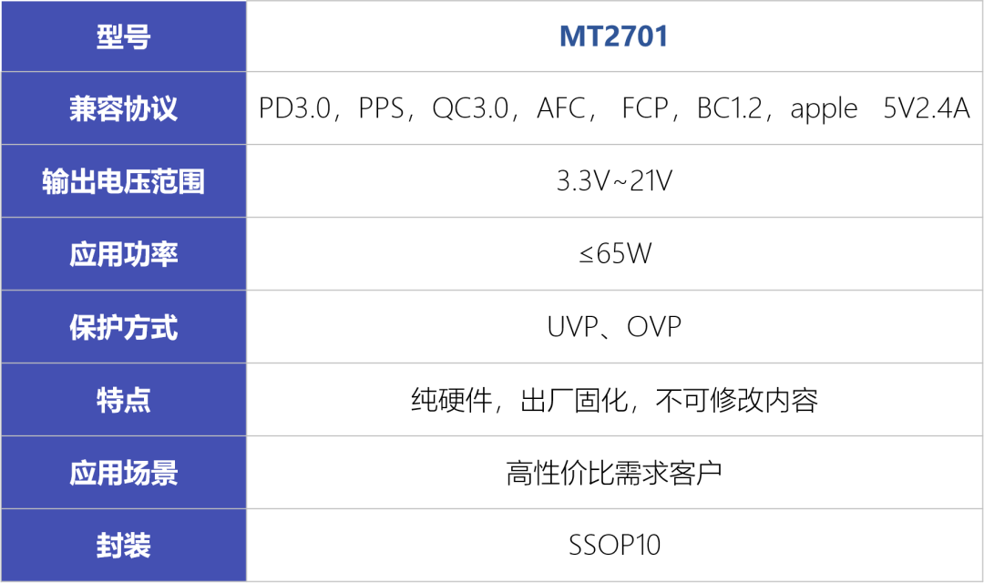 尊龙凯时开发的快充协议芯片包括MT2701和最新的MT280X系列,芯片兼容多种快充协议。MT2701支持65W以内应用,兼容PD3.0,PPS,QC2,QC3,AFC,FCP,私有协议低压直充5V4.5A,Apple 5V2.4A,BC1.2等常用协议。MT2701采用纯硬件架构,通过外部元件来调节输出功率段,应用简单,BOM成本低,适合不需要USB-IF认证的客户。