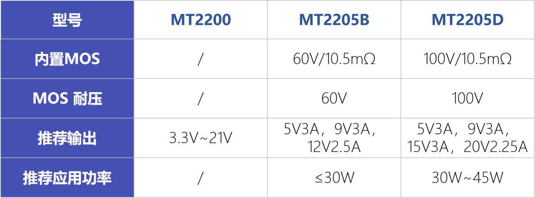MT2200可输出3.3V~21V,满足USB PPS宽电压输出要求。MT2205内置Si MOS,利于小型化设计。