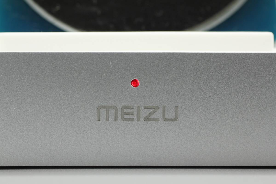 底座前端印有MEIZU品牌,并设有一颗LED充电指示灯。