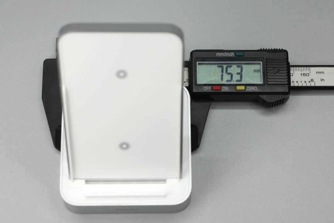 魅族这款无线充由底座和手机支撑板两部分组成,支撑板正面是ABS材质钢化玻璃,十分光滑,支撑板和底座侧身均喷砂银灰色涂料进行装饰。