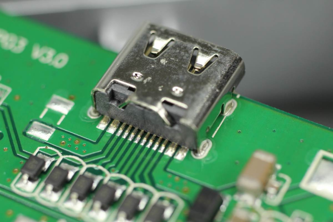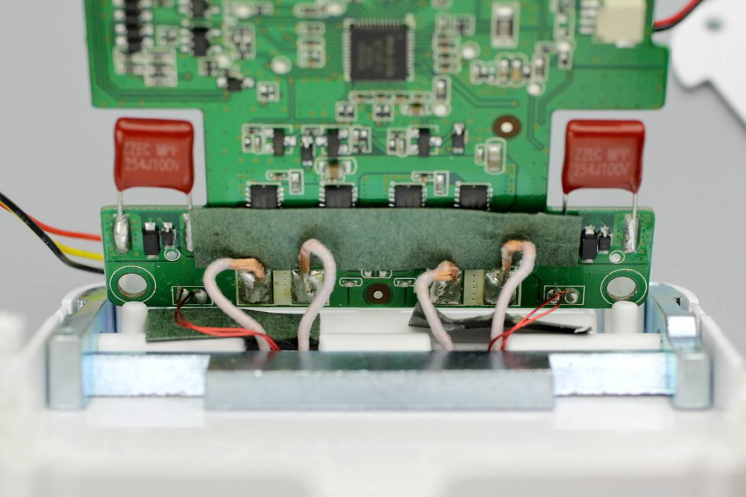 隔离塑料板以及PCB板也是使用两颗螺丝进行固定,PCB板背面没有设元器件,两侧的两颗电容处镂空处理。