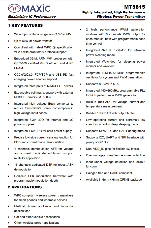 MT5815集成ARM M0 处理器,拥有卓越的高效率和紧凑设计,适用于各种低成本、低功耗应用,可广泛应用于为5G智能终端、智能可穿戴设备、智能家居、物联网、智能家电进行无线充电的设备。充电头网此前已对该芯片做了相关报道。