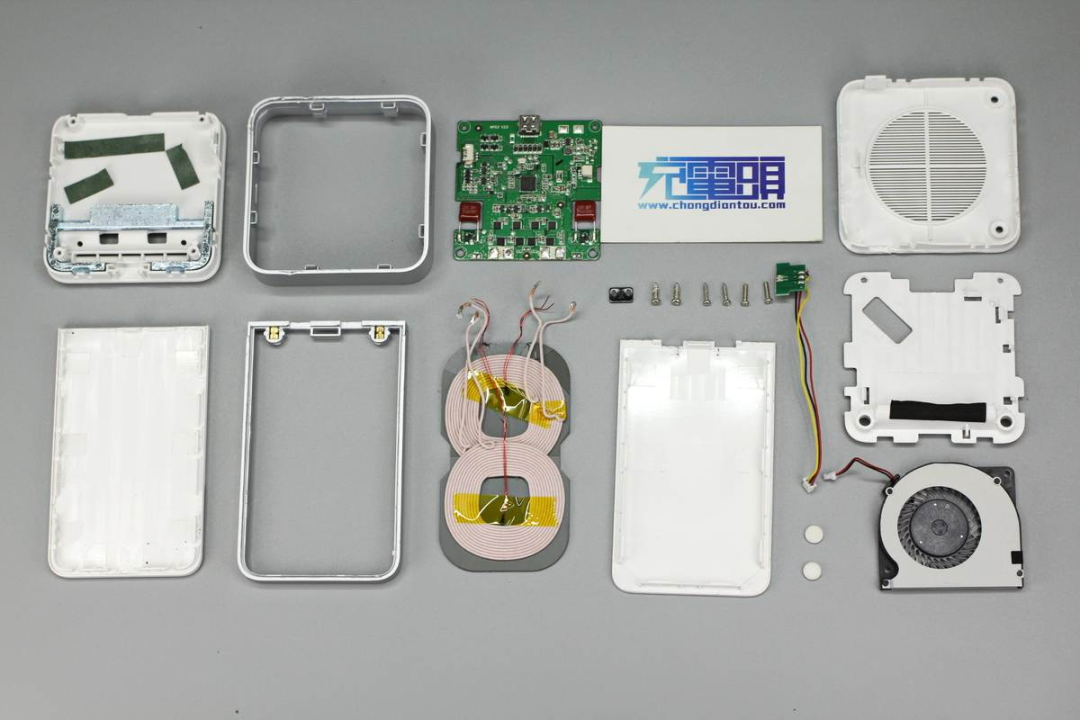 这款无线充电器内置小风扇,可在无线充电过程中进行主动散热。此外立式机身设计让其减少了桌面占地空间并可以作为手机支架使用,40W无线充电功率也让使用体验更上一层楼,很快就能让手机满血复活。下面充电头网就对这款产品进行详细拆解,看看内部设计用料如何。