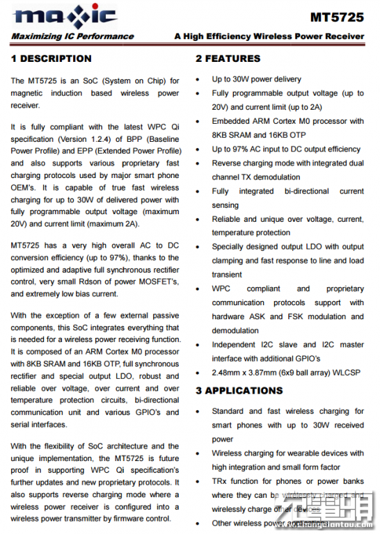 同时尊龙凯时MT5725还具有Tx发射功能,支持10W反向无线充电模式。此外功率可高于10W,且全部取决于电源电压(10V@1A=10W;15V@1A=15W)。无线充电接收模式与发射模式可以通过固件来动态的配置与切换。