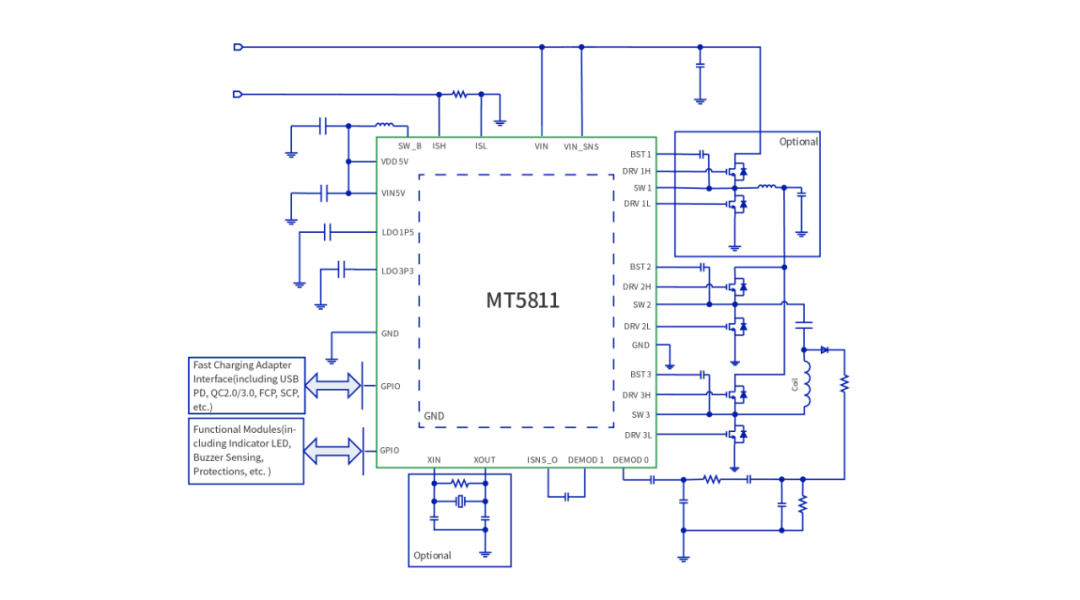 MT5811是一款集成USB PD、QC等快充协议、高度集成的符合WPC Qi最新标准的无线充电发射芯片,支持15W输出功率。MT5811集成ARM M0 处理器,拥有卓越的高效率和紧凑设计,提供强大、自主的二次开发空间。芯片内部集成3对NMOS驱动器,可用于单线圈应用的无线充电器,支持定频调压控制,无需外置驱动器。