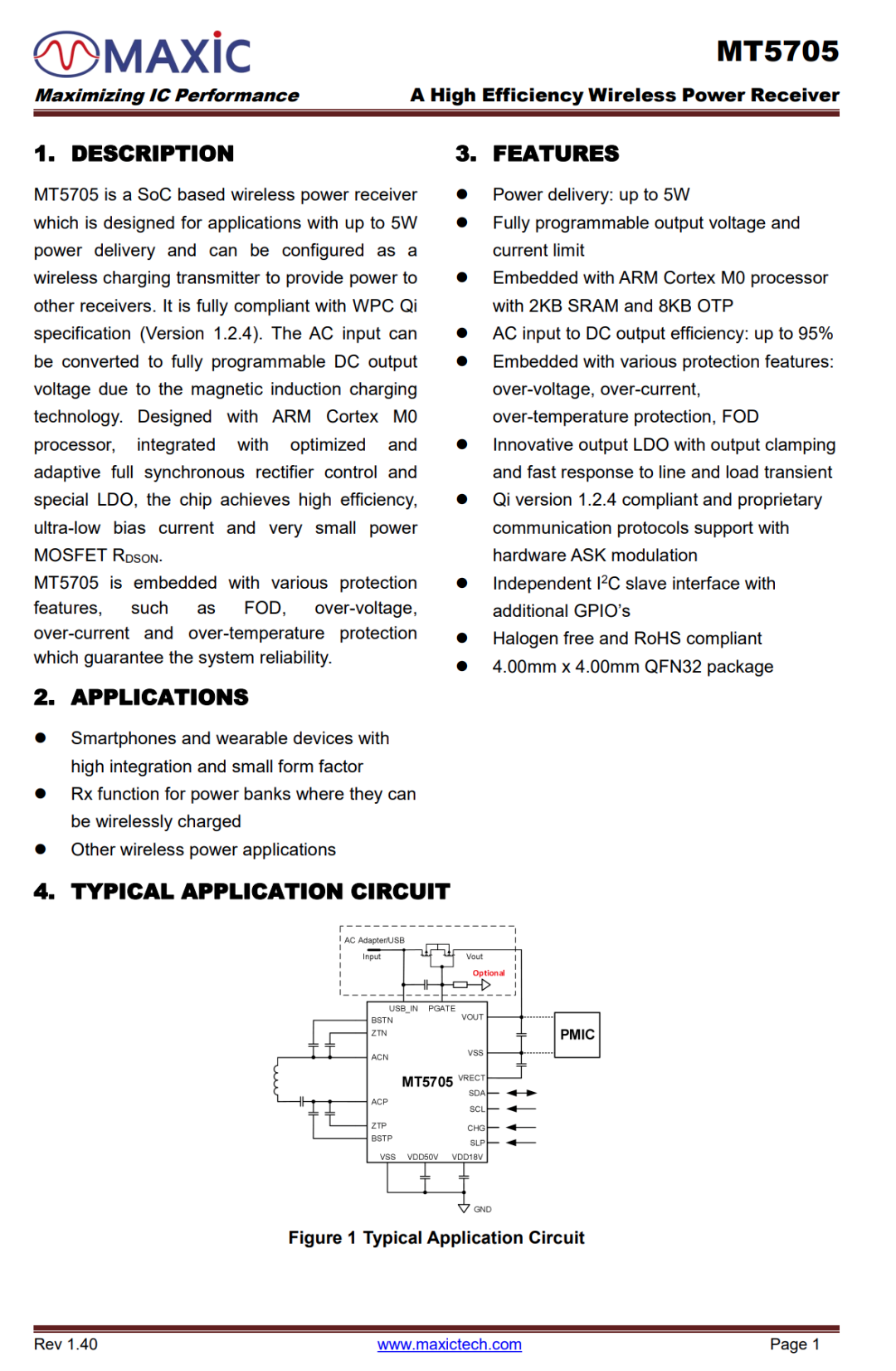 MT5705是一款基于磁感应的无线充电接收器SoC(片上系统),采用嵌入式ARM Cortex M0处理器,2KB SRAM,8KB OTP,完全符合BPP的WPC Qi规范(版本1.2.4)。