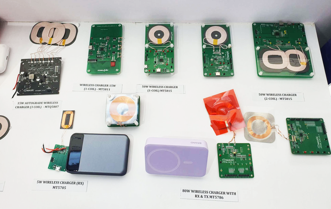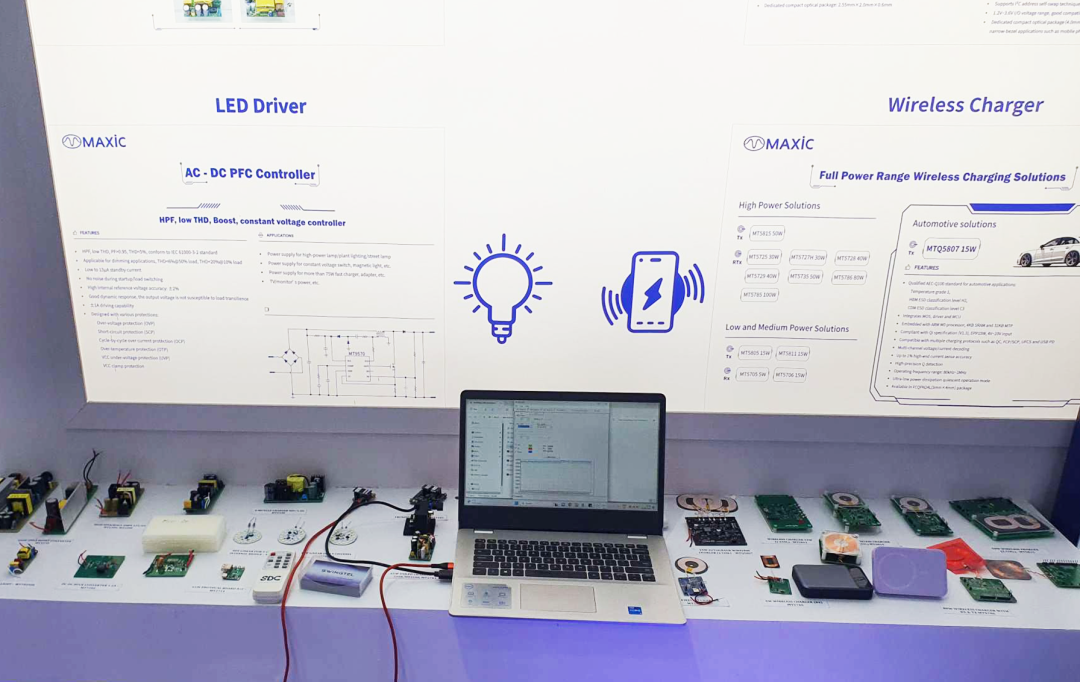 无线充电产品重点展示了全功率段无线充电解决方案,满足大功率(专为手机无线充电而生的80W大功率Rtx芯片MT5786)、中小功率(15W All-in-One RTX/TX解决方案MT5706+MT5805)及车规级(15W车载无线充电芯片MTQ5807)等多功率段,适用TWS耳机、手表、电动牙刷、手机、PAD、移动电源、无线充电器、汽车电子等多终端产品应用。